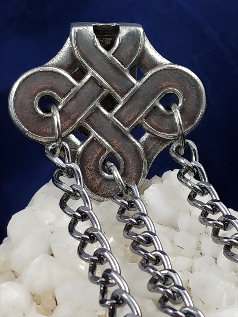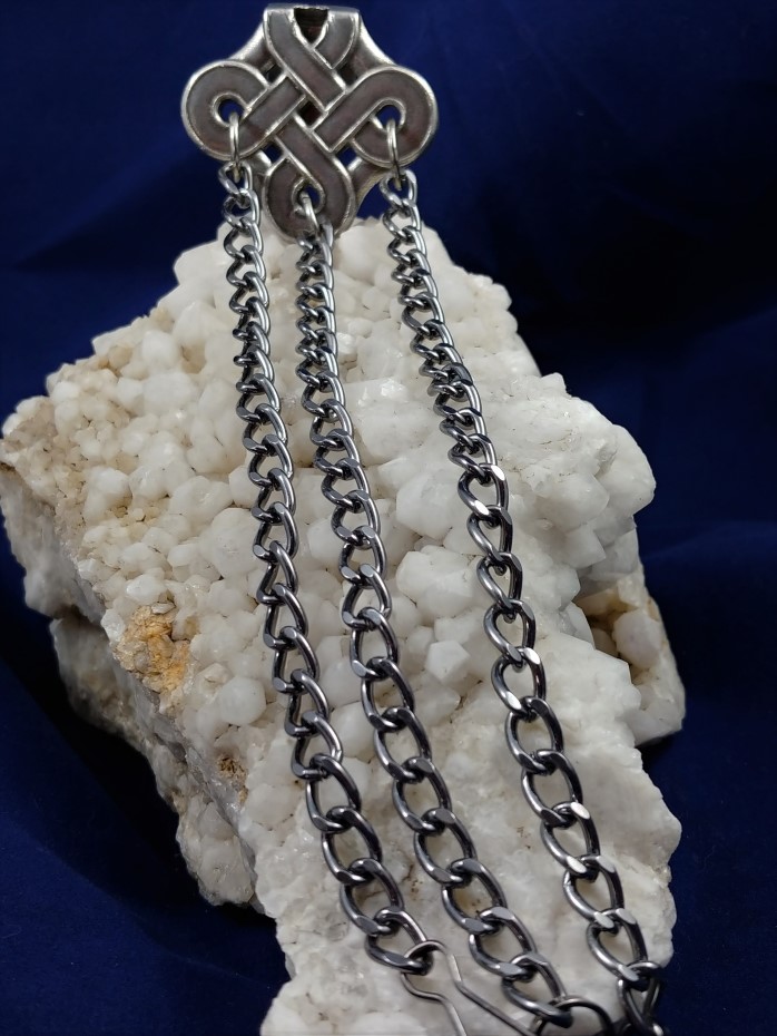 New post Edwardian Celtic Knot Design Chatelaine. Chatelaines are an adornment used by both men and women and usually fastened to belt or pocket. They typically have 3 - 7 chains bearing hooks on which to hang small articles such as watches, keys, seals, writing tablets, scissors, and purses. The word chatelaine is derived from a word meaning the keeper of a castle, thus the person entrusted with the keys. Chatelaines were particularly popular during the 18th century and ranged from very simple to very ornate (gold with diamonds). Chatelaines could still be found through the early 20th century commonly worn to distinguish ones position, for instance the wearing of a Chatelaine would distinguish the head housekeeper from the other servants.