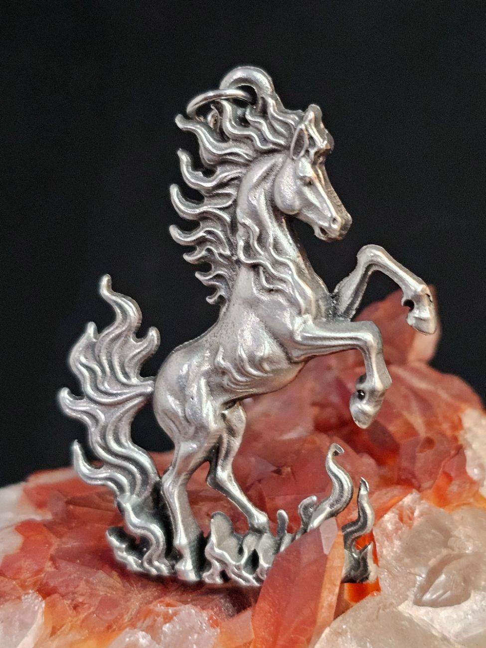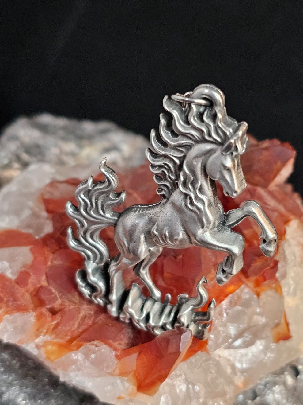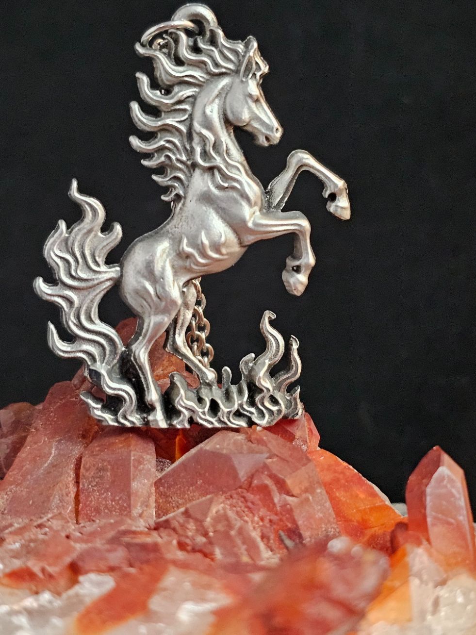 Cast in lead free pewter this stunning fire horse is ready to lead you into your new adventures. This is a single sided pendant that is flat on the back. Complete with an 18"chain.